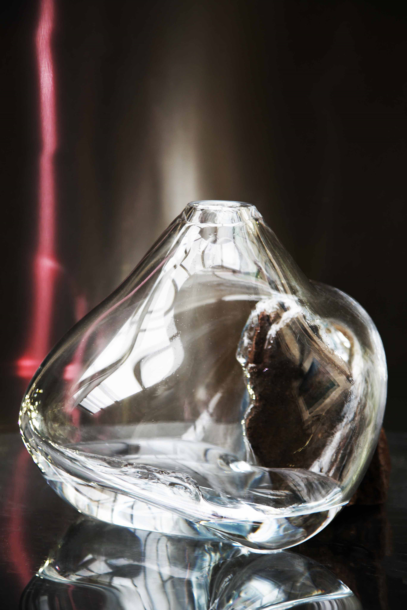 Taillet Sophia, «Rise From the Abyss» is a series of blown glass pieces. In the process of researching the con- frontation between molten glass and rock. This project is part of an ongoing artistic process that involves the use of raw or ganic elements as a trigger for a new form of expression. An accumulation of rocks overlapped in a aleatory manner is used as a mold for the molten glass. In a search for purity and sensitivity, the glass freely takes shape in contact with the stones and slowly takes its imprint. Only a fragment of the stone mold remains in the final piece as a witness of this meet- ing be tween these two elements. The shapes of the molten glass freely unfold in the space beyond the hand of the craftsman and the eye of the designer - Like a wild landscape: the material lives and evolves according to its environment. Series of 5 Shipped from France Item liable to VAT ∅ 25/30 x 11/35 cm 2021