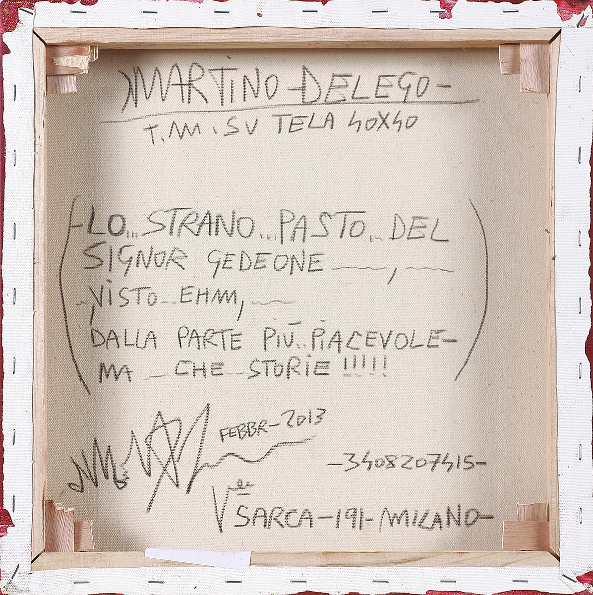 DELEGO MARTINO (n. 1956) Lo strano pasto del Signor Gedeone. 2013. Tecnica mista su tela. Cm 40,00 x 40,00 x 4,00. Firma e data in basso a sinistra. Al retro firma, data e titolo. Autentica dell'artista su fotografia.
