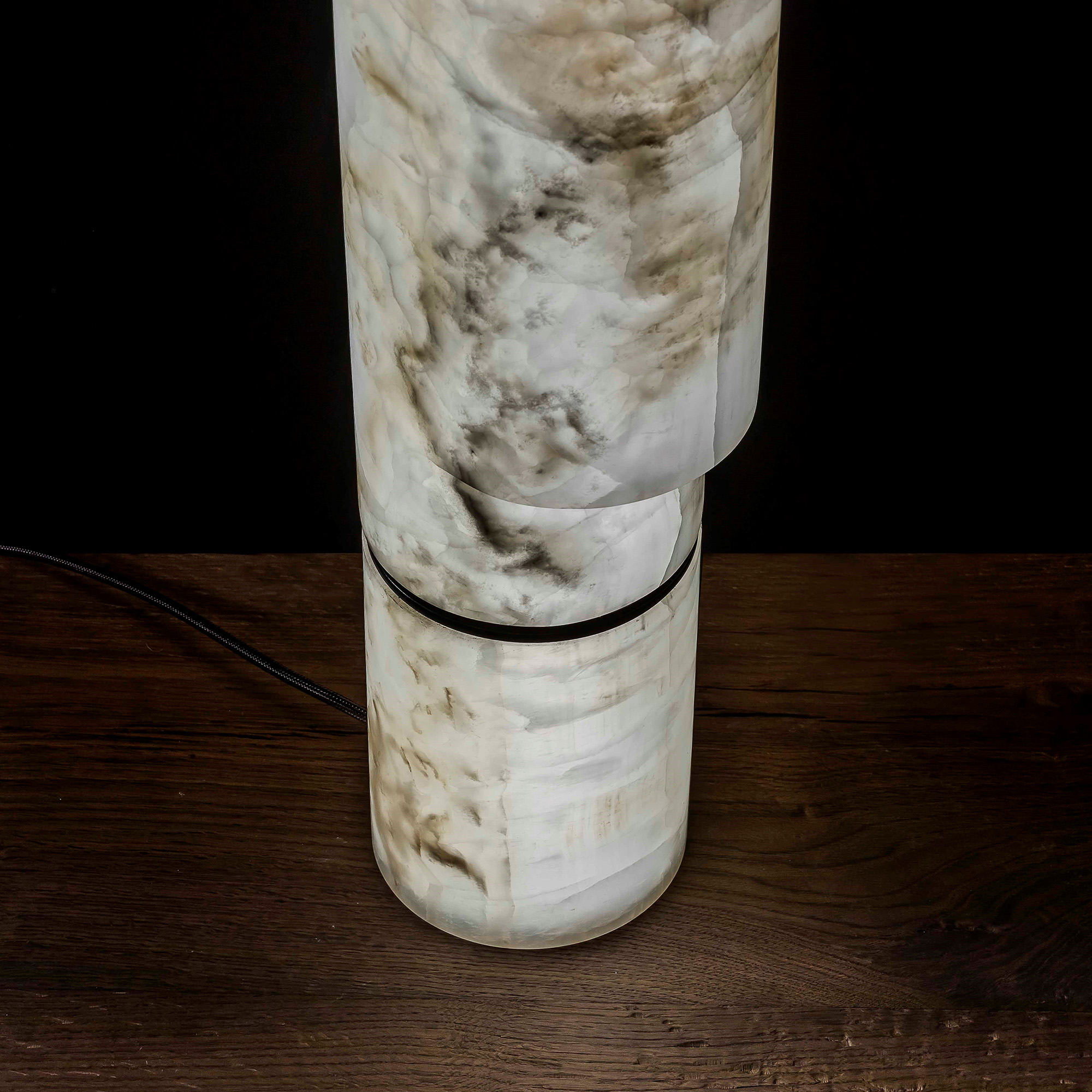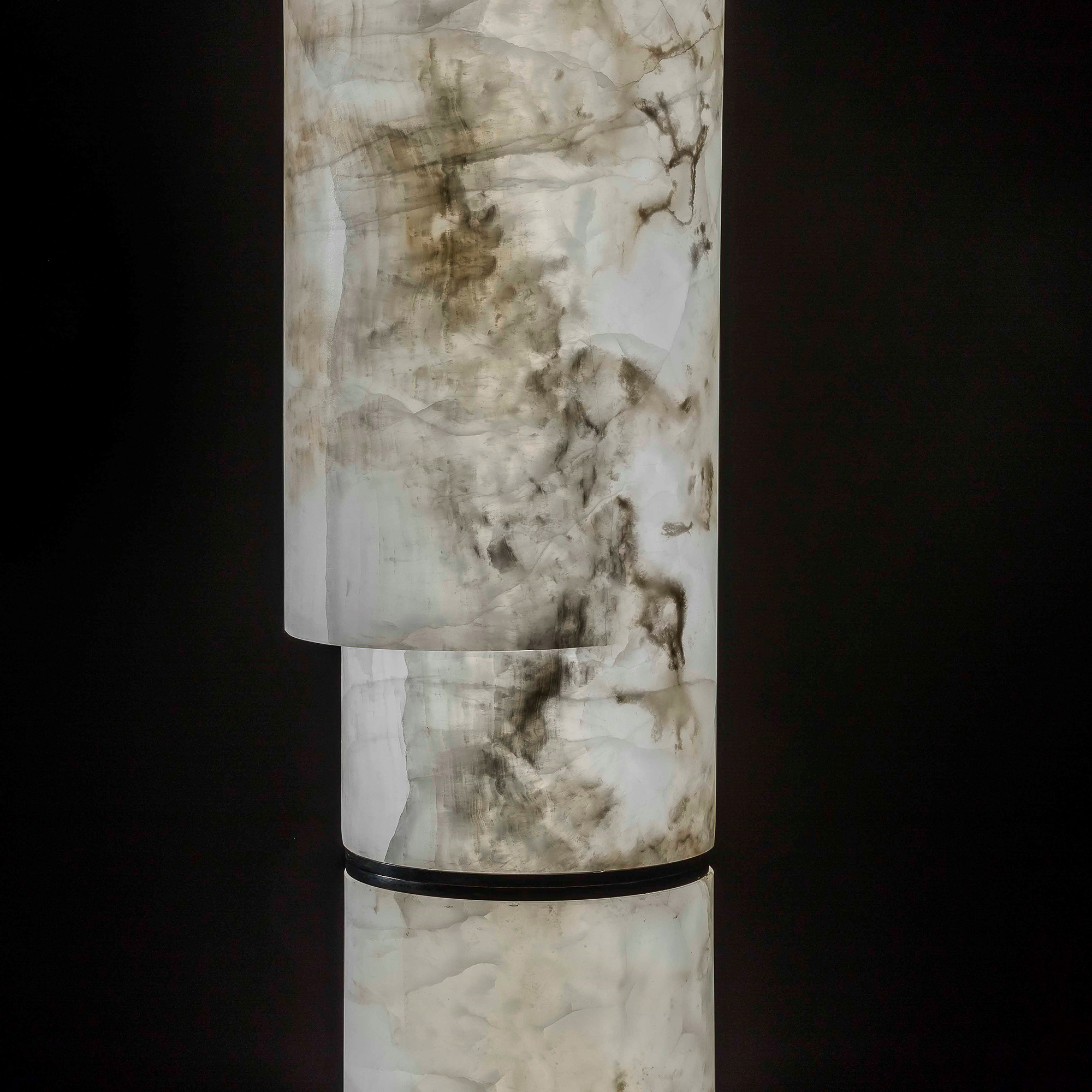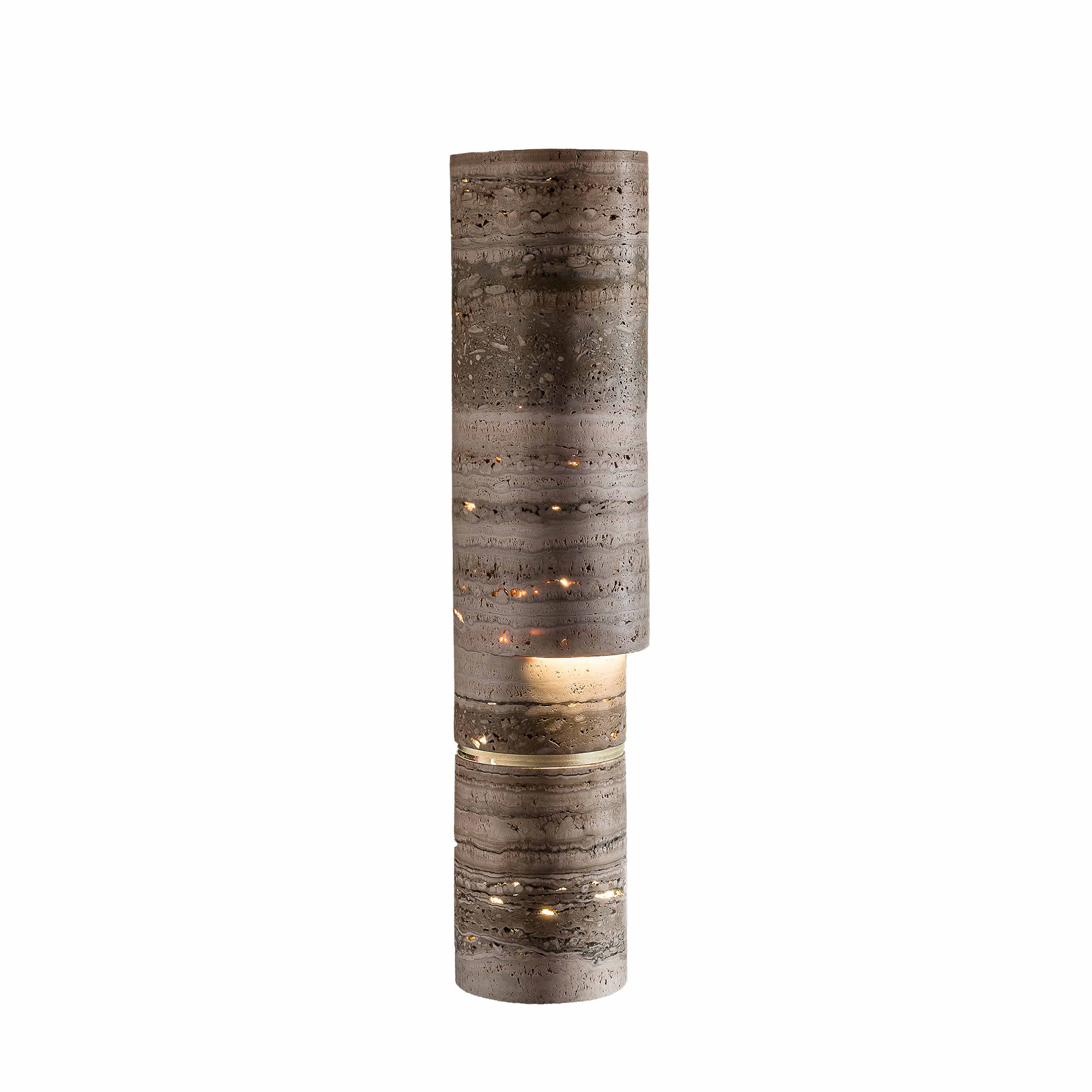 Cacciatori Ugo, Born from a precise selection of the designer Ugo Cacciatori while researching new materials to state and transpose the aesthetical genius of the brand, the TEST lighting series is a new chapter of HENGE into the interpretation of the light. The generous table lamp TEST-ONE surprises since the first touch of its neck. The modern menhir take on a life of its own, expressing in full the dedicated mate- rials: the sand polished Ice Onyx becomes white as a moon, the stone turns from sculptural opalescence to bright brutalism; mysterious as a dying star when the nucleus of the Rapolano Travertine shines through its natural cavities and the open shape resulting from the peculiar undercut crafting. -- Edition of 20 Shipped from Italy Item liable to VAT Largh. 18 - Prof. 15 - Alt. 71 Cm 2021