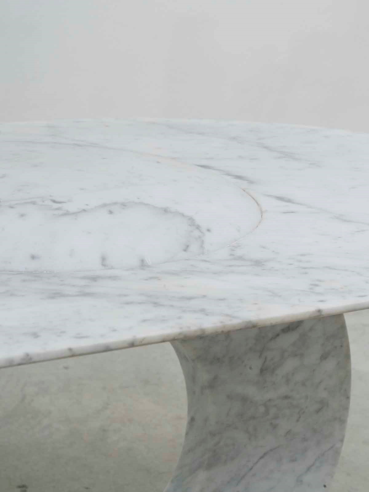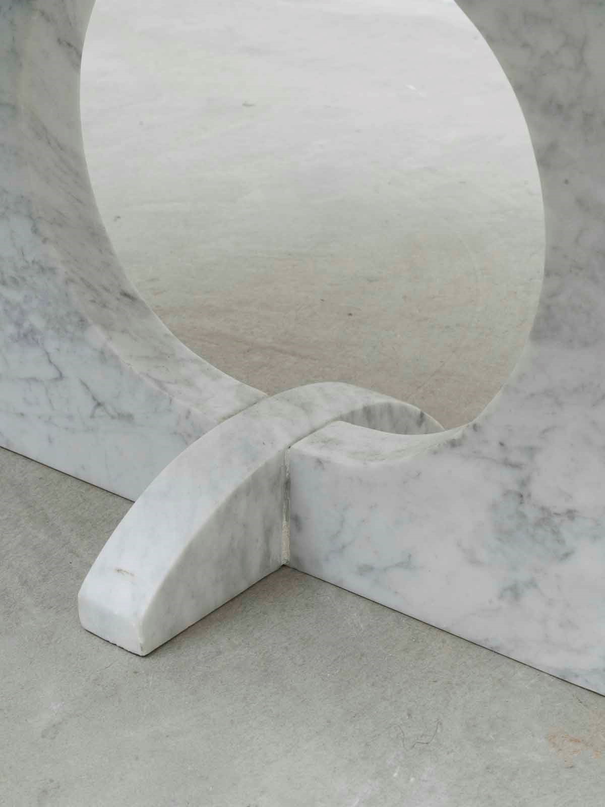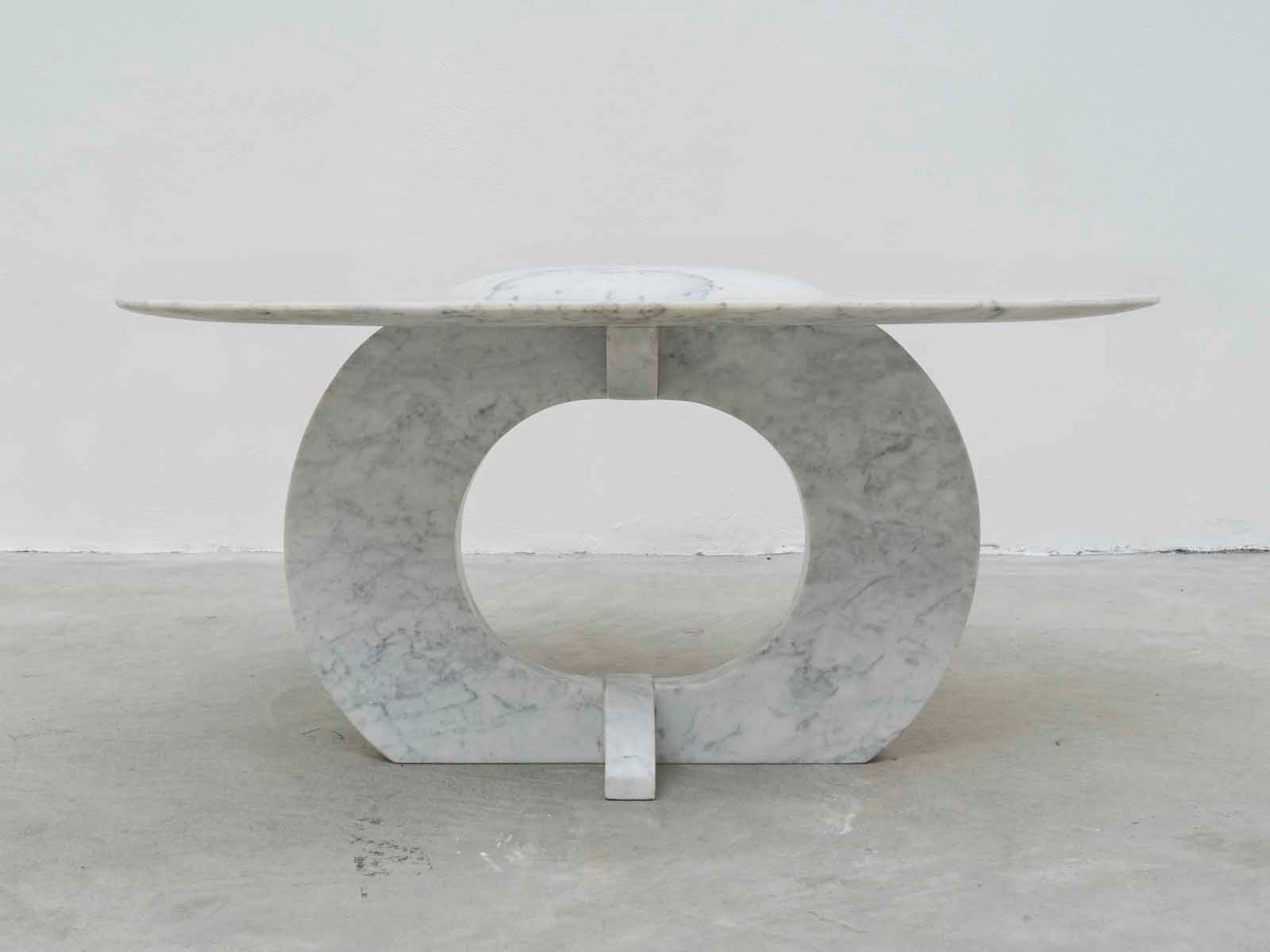 West Will, This is a unique piece created by English artist Will West in 2015. It is made of solid Carrara marble. This piece, originating as many of other West’s works from scraps of larger marble slats, plays with the idea of coffee table, deliberately sab- otaging its function: the central part of its top is round, so it is hard to place any object on it, except on its edges. This piece was shown as part of the exhi- bition “Family Matter” during Milan Design Week 2019 and has never been owned. -- Unique Shipped from Italy Item liable to VAT Largh. 39 - Prof. 80 - Alt. 49 Cm 2015