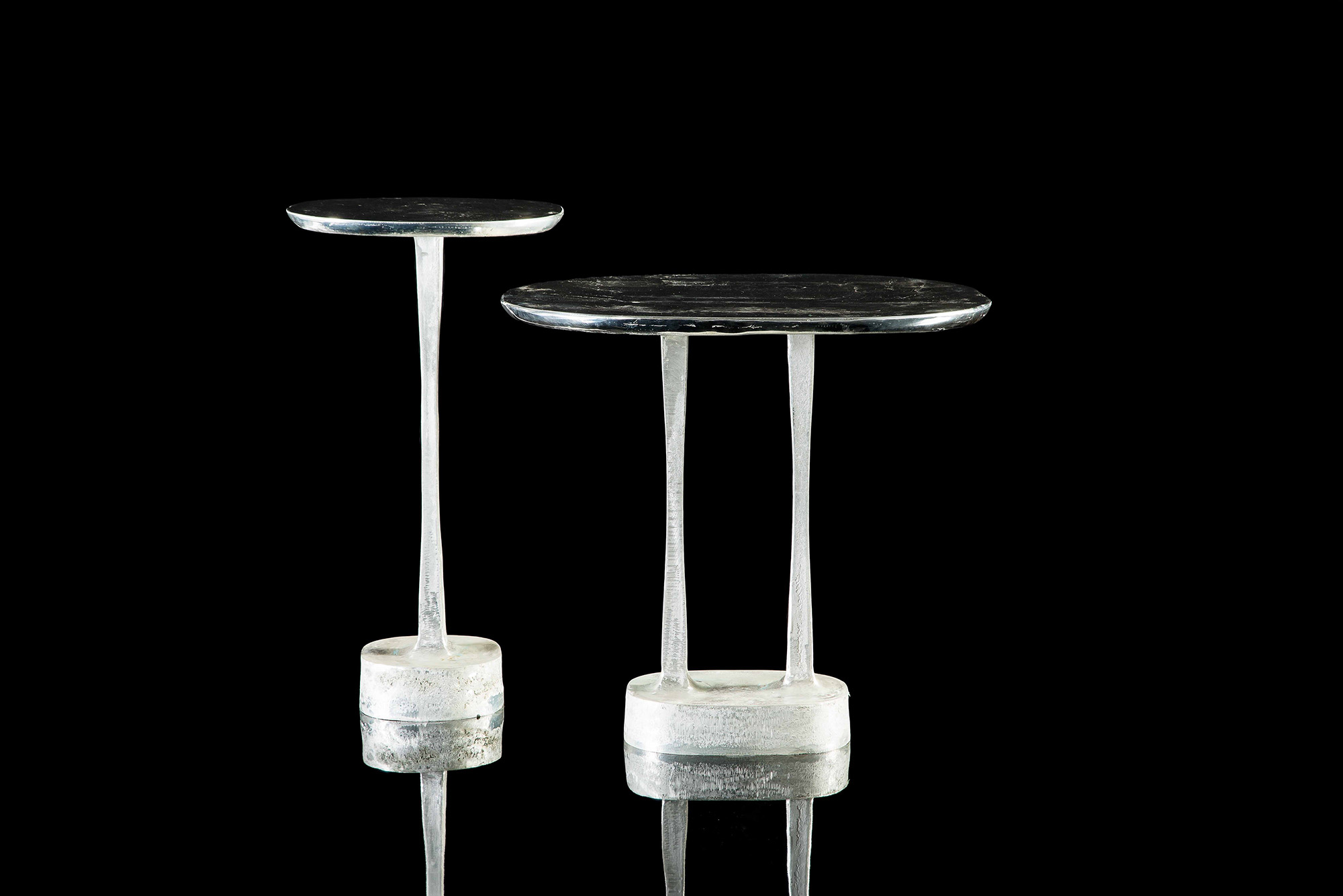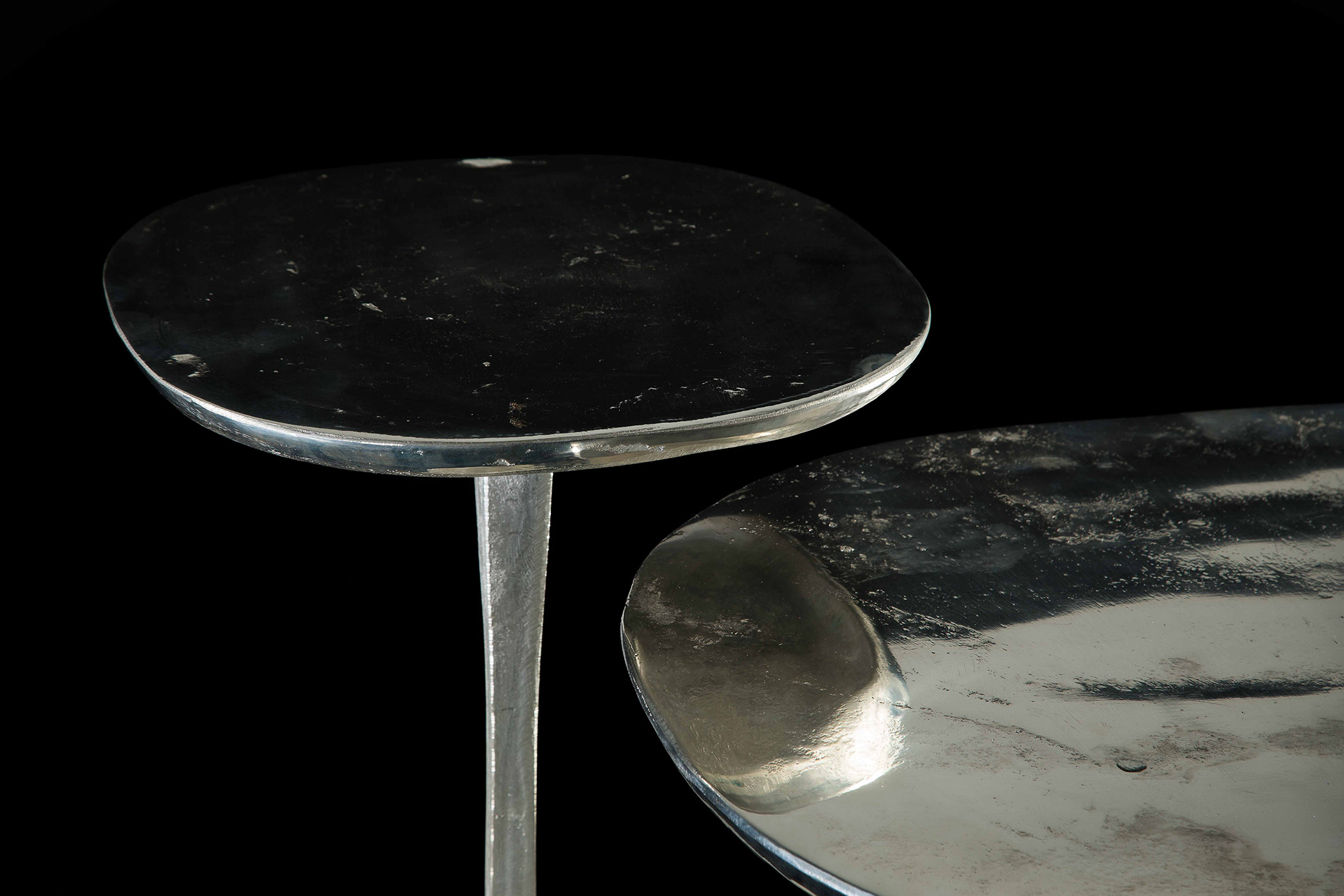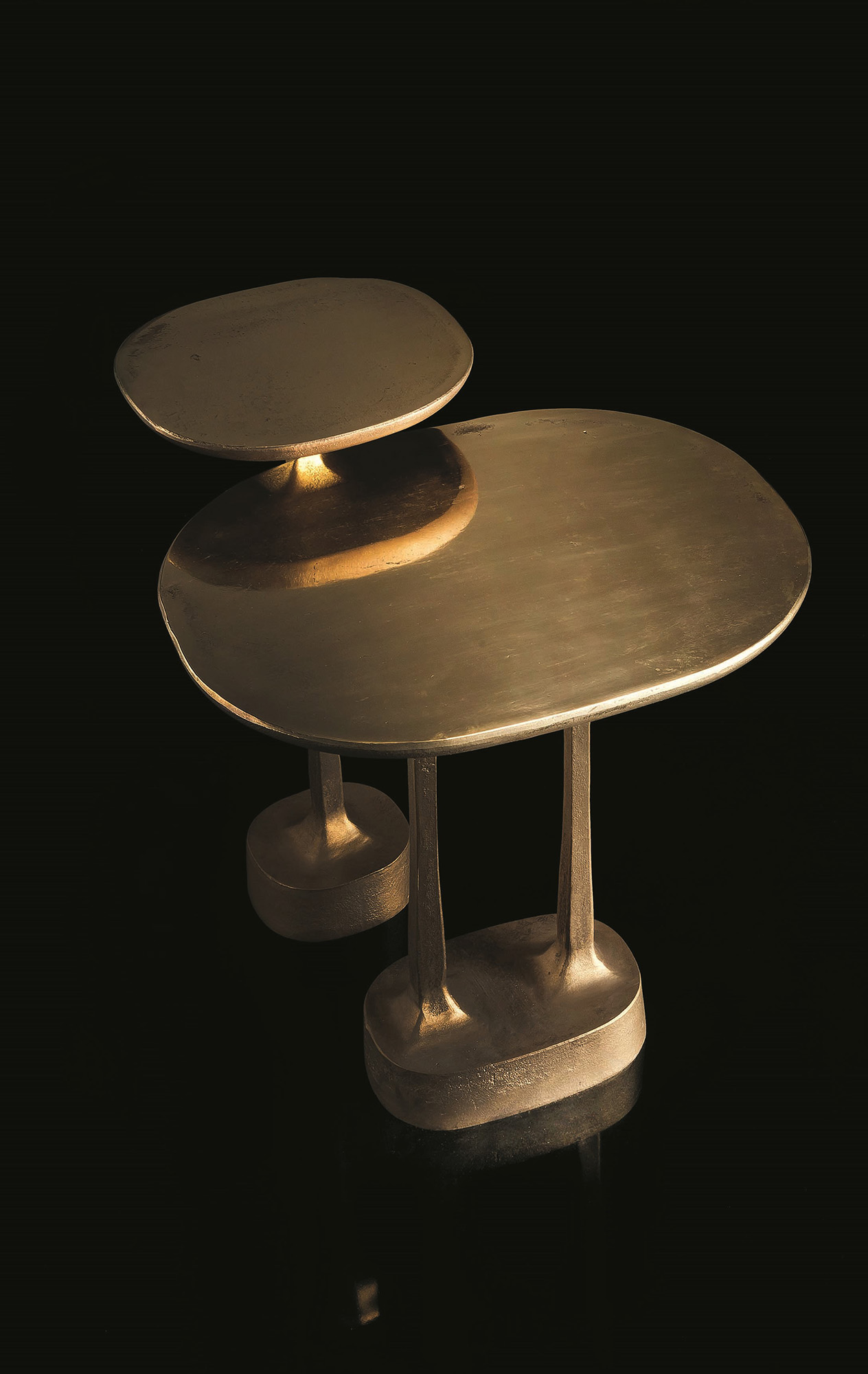 Yabu Pushelberg, The collaboration between Henge and the multidis- ciplinary design firm Yabu Pushelberg gave birth to MUSHROOM, the family of coffee tables paying hom- age to the natural world. The metallic MUSHROOM pieces feature a physical and visual unexpected lightness with their organic-like shapes: devised as a pair in two complementary con- figurations, the coffee tables with their different size tops create fluid multiform compositions. The exclusive fusion process unveils a champagne-colored gloss finish showing Henge’s infinite production possibilities developed by the experienced Italian craftsmen. -- Edition of 20 Shipped from Italy Item liable to VAT 1) 60 x 32 x h 32 cm 2) 53 x 55 x h 46 cm 2017