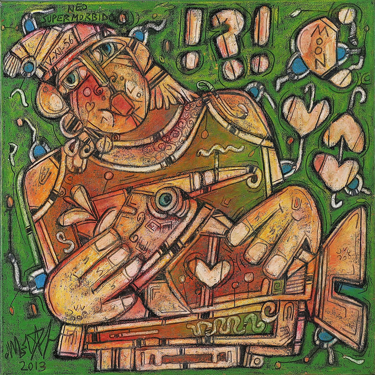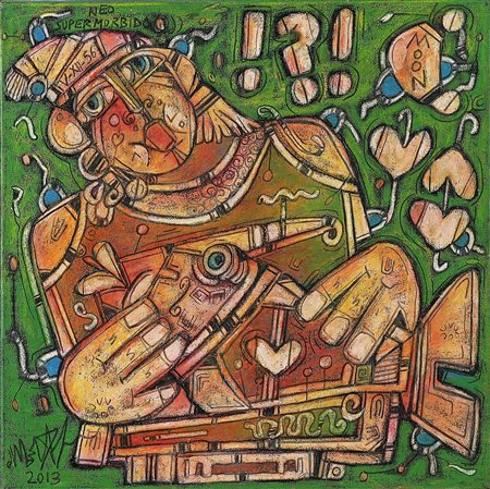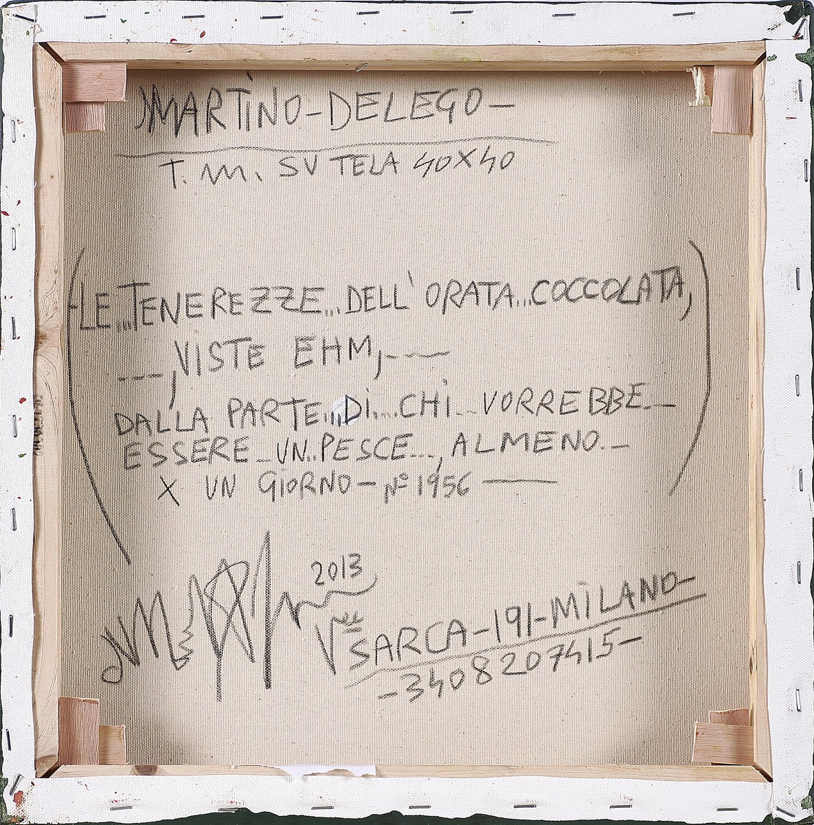 DELEGO MARTINO (n. 1956) Le tenerezze dell'orata coccolata. 2013. Tecnica mista su tela. Cm 40,00 x 40,00 x 4,00. Firma e data in basso a sinistra. Al retro firma, data e titolo. Autentica dell'artista su fotografia.