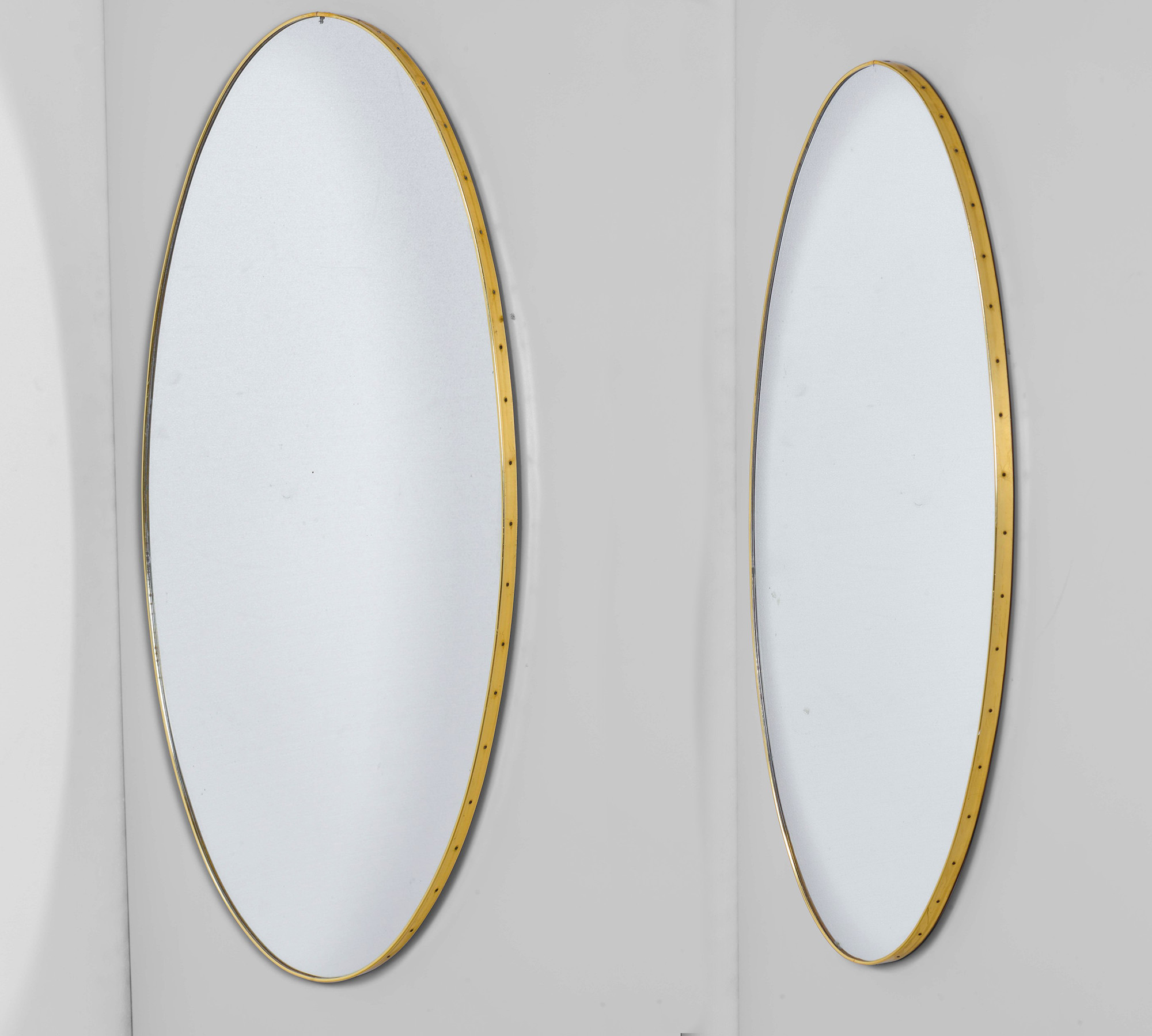 Due specchi ovali con struttura in legno e profilo in ottone.,