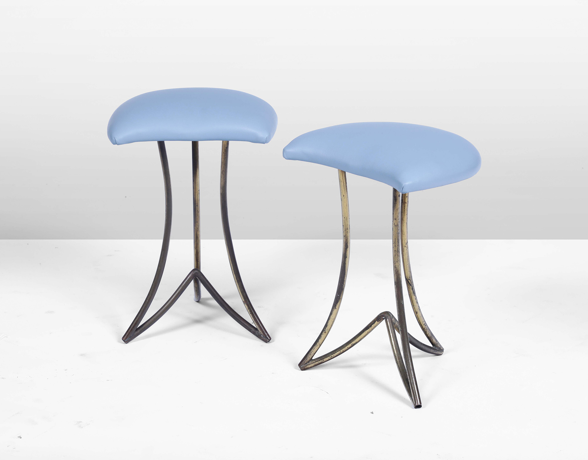 Coppia di sgabelli con struttura in ottone e rivestimenti in skai.,