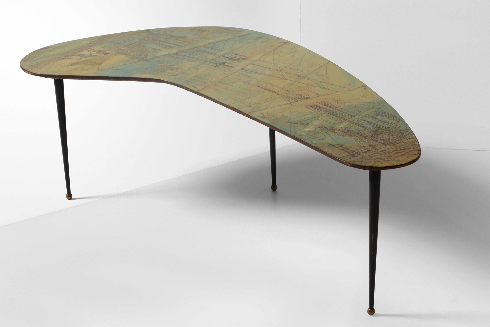 Decalage, Tavolo basso con piano in legno dipinto e sostegni in metallo laccato e ottone. Firma originale. Prod. Italia, 1950 ca. cm 120x60x40