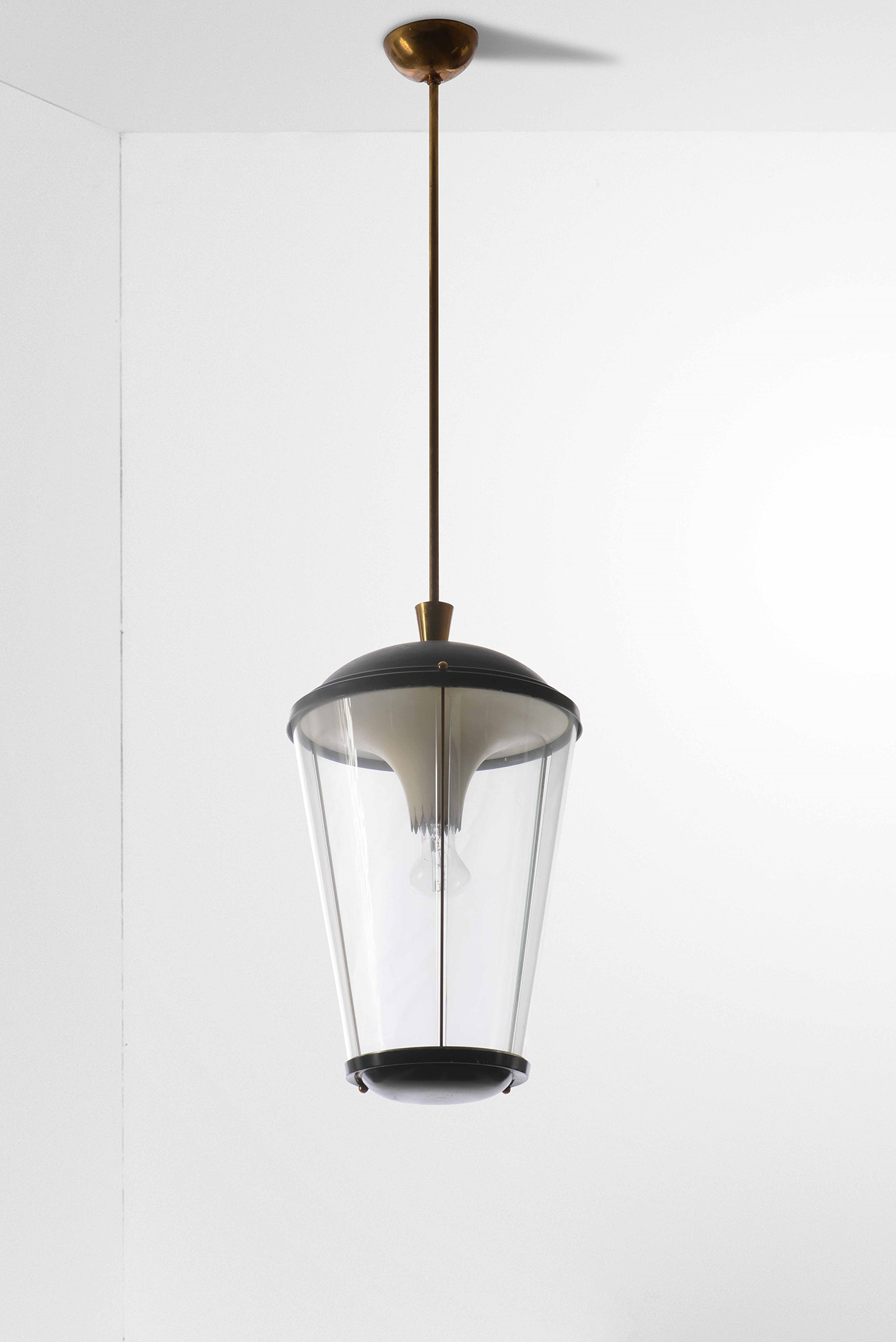 Due lampade a sospensione con struttura in ottone e metallo laccato. Diffusori in vetro., Prod. Italia, 1950 ca. cm 27X110