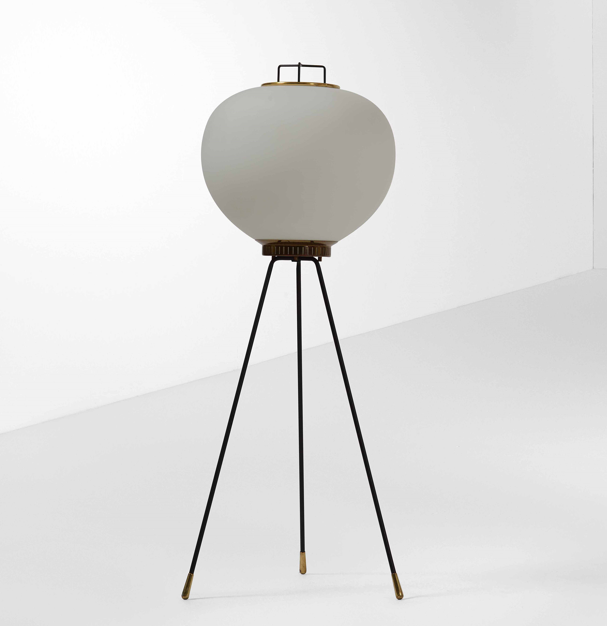 Lampada da terra con struttura in ottone e metallo laccato e diffusore in vetro opalino satinato.,