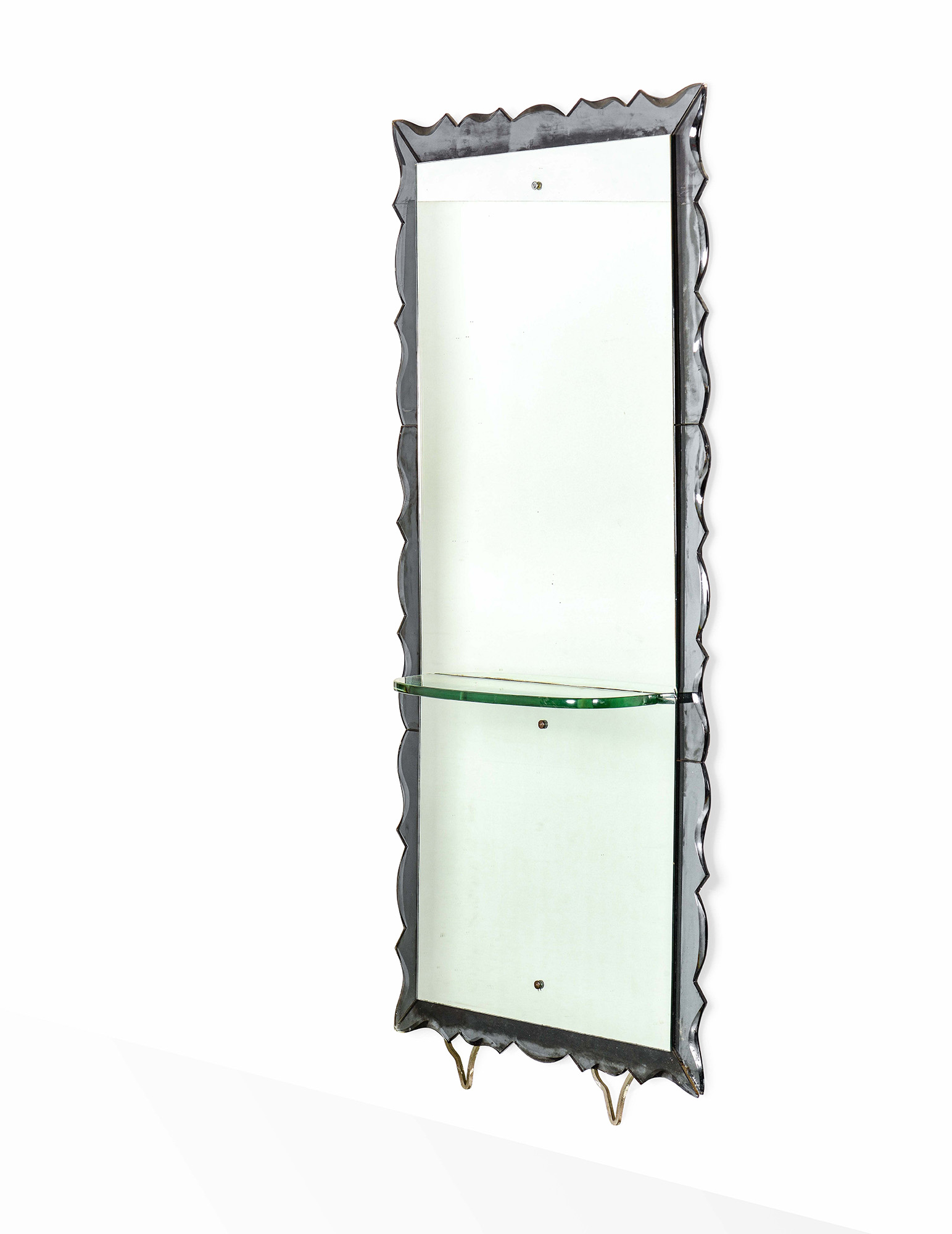 Cristal Art, Grande specchiera con cornice in vetro colorato, cristallo specchiato, molato e sagomato. Dettagli in ottone. Mensola in cristallo molato. Prod. Cristal Art, Italia, 1960 ca. cm 208x100x25 cm 208x100x25