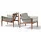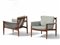 Coppia di poltrone con struttura in legno e rivestimenti in tessuto.,