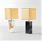 Due lampade da tavolo con base in resina laccata e diffusore in tessuto. Elementi in ottone.,