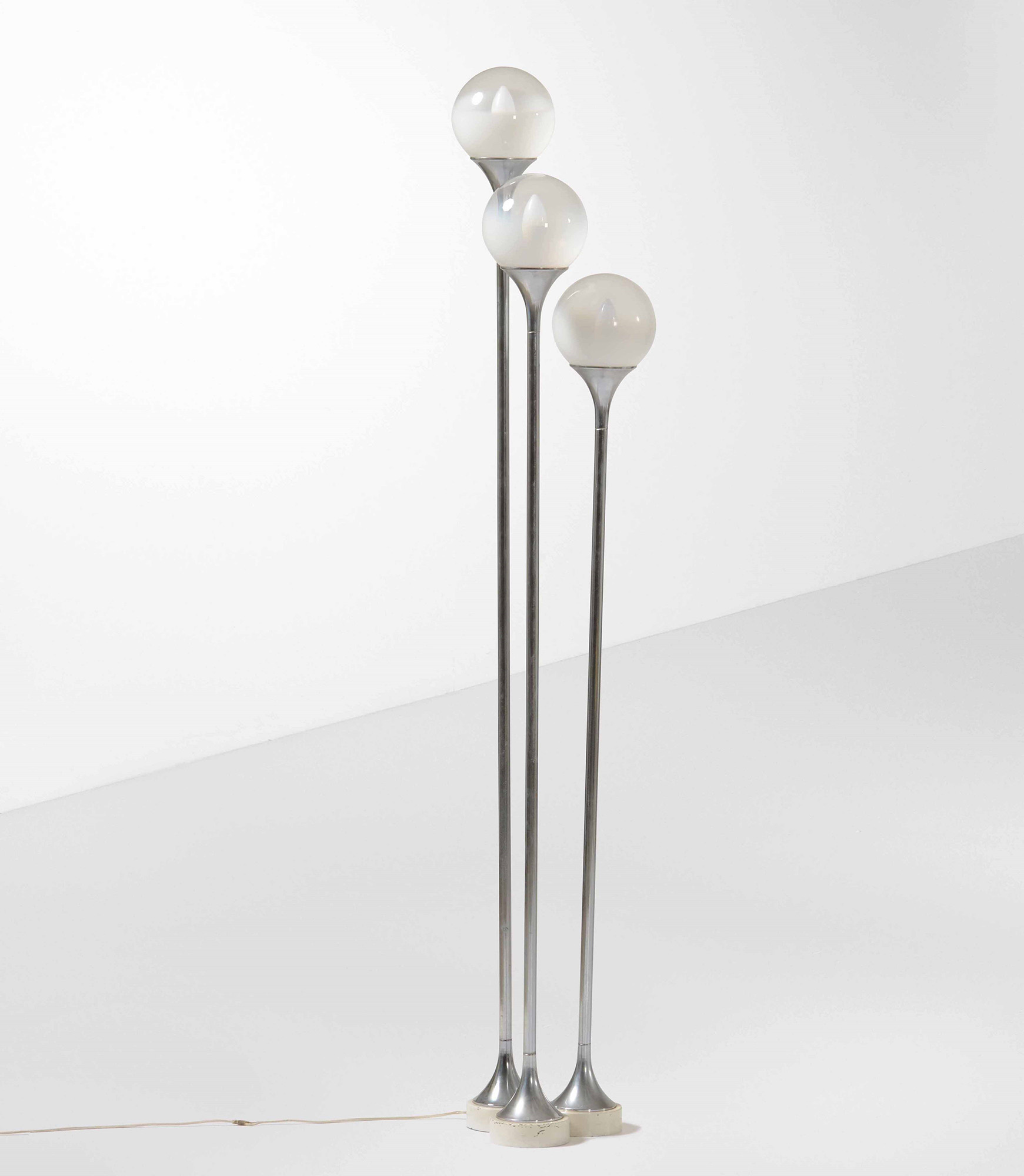 Lampada da terra con struttura in metallo cromato e metallo laccato e diffusori in vetro.,