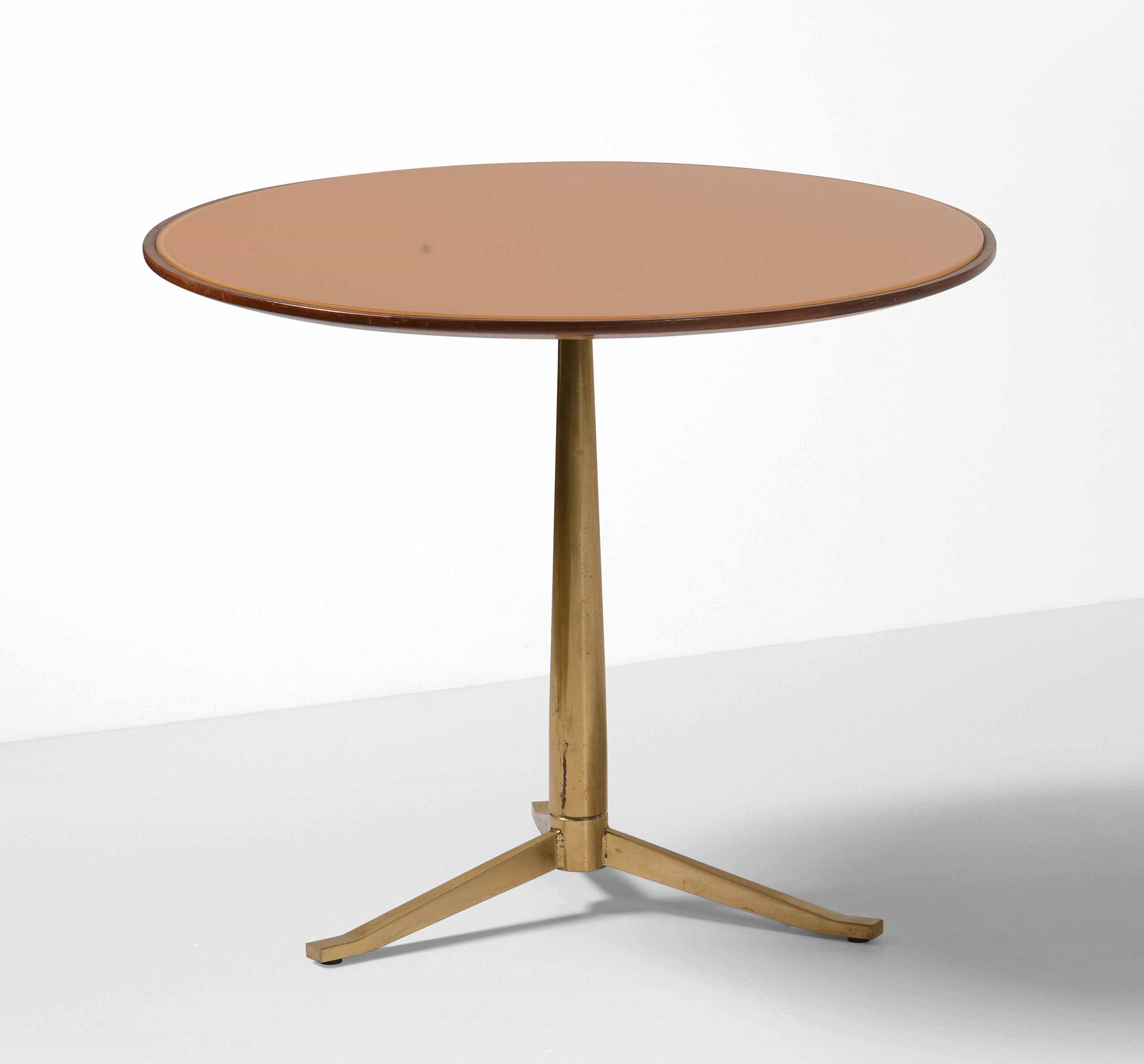 Tavolo basso con struttura in ottone e piano in vetro colorato.,
