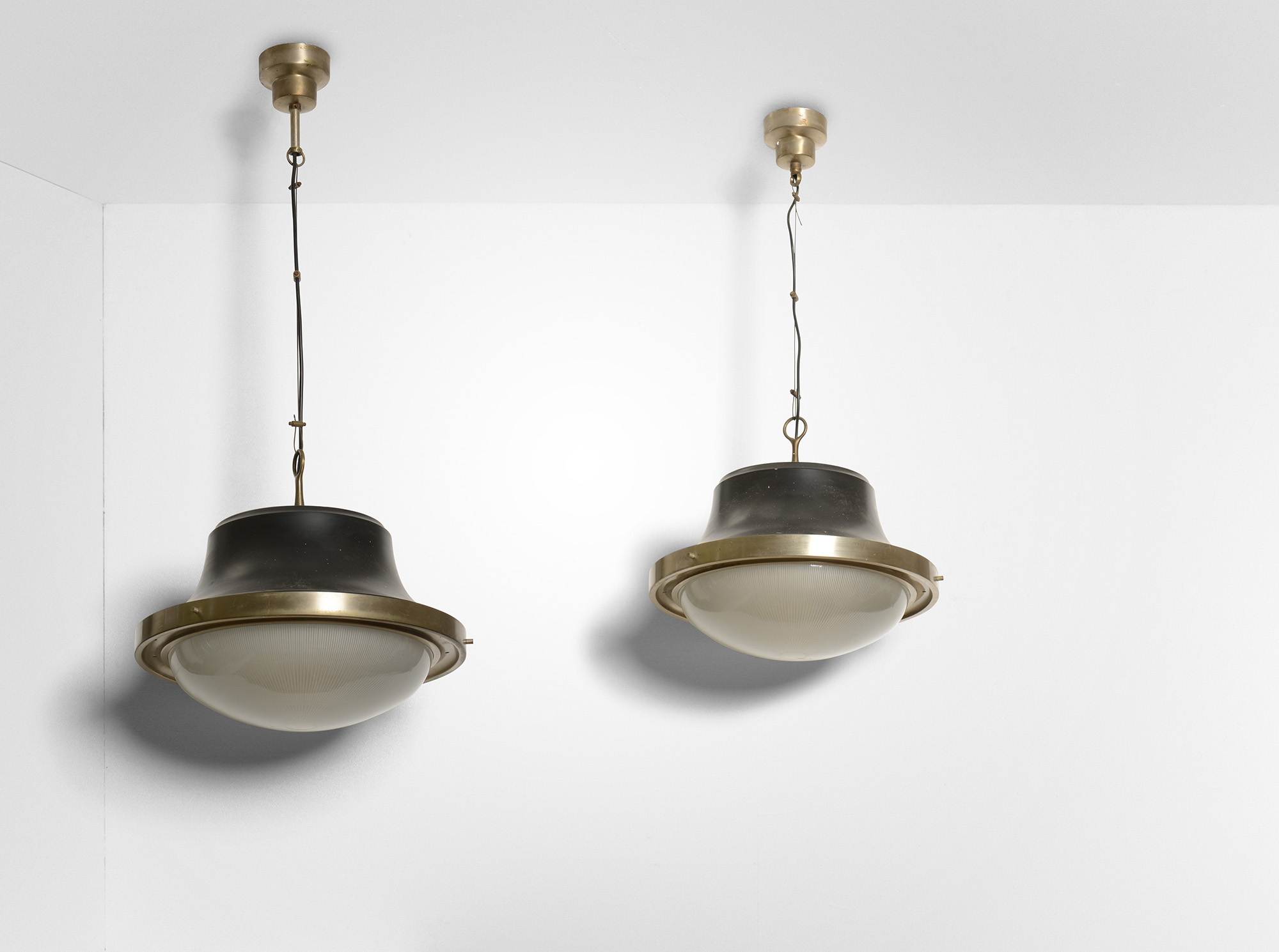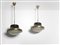 Sergio Mazza, Coppia di lampade a sospensione mod. Tau in metallo e diffusore in vetro stampato. Prod. Italia, 1970 ca. cm 45x45x95