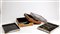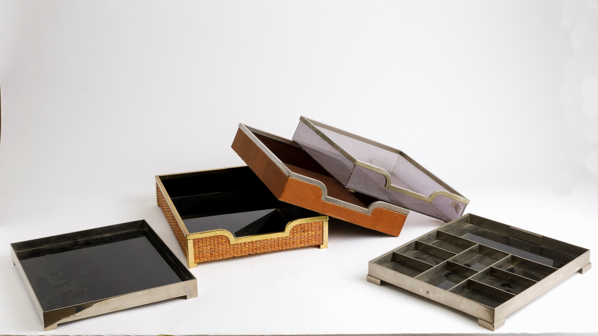 Gabriella Crespi, Set di oggetti da scrivania comprendenti un portaoggetti in acciaio con firma incussa, un portafogli nero e acciaio con firma incussa, un porta fogli in cuoio con bordo in acciaio, - un porta fogli in plexiglass con firma, un porta fogli in rattan con firma incussa. Prod. Italia, 1970 ca. cm 33x26,5x6,5 e cm 25x29x3,5