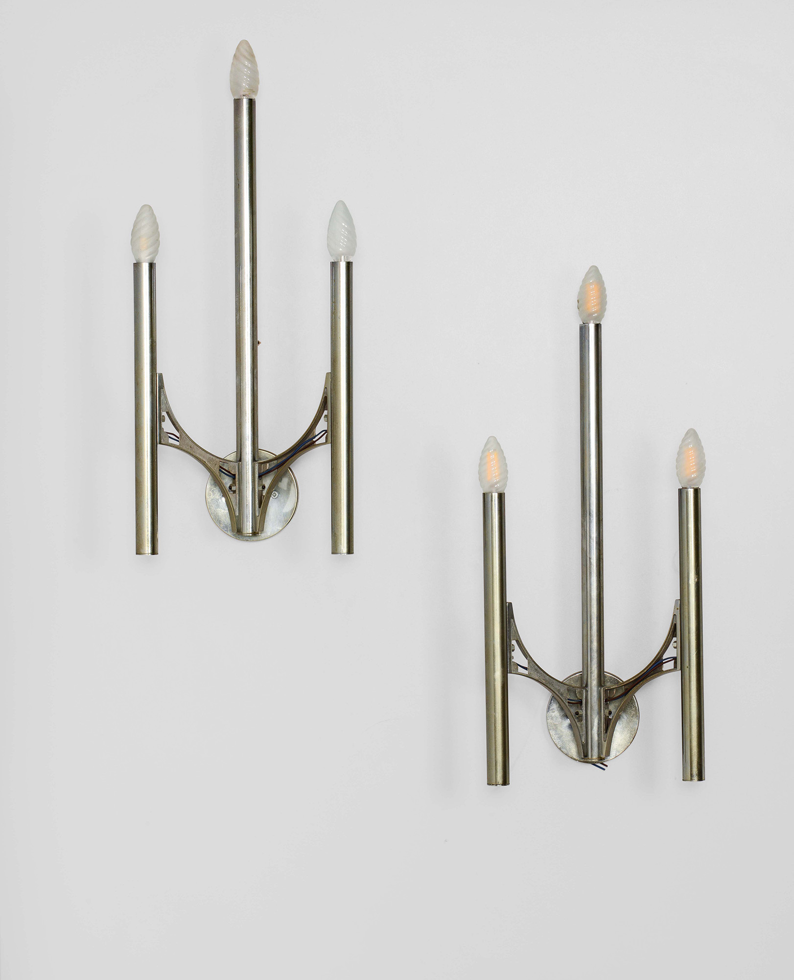 Gaetano Sciolari, Coppia di lampade da parete con struttura e diffusori in metallo nichelato. Prod. Italia, 1970 ca. cm 25x50x15
