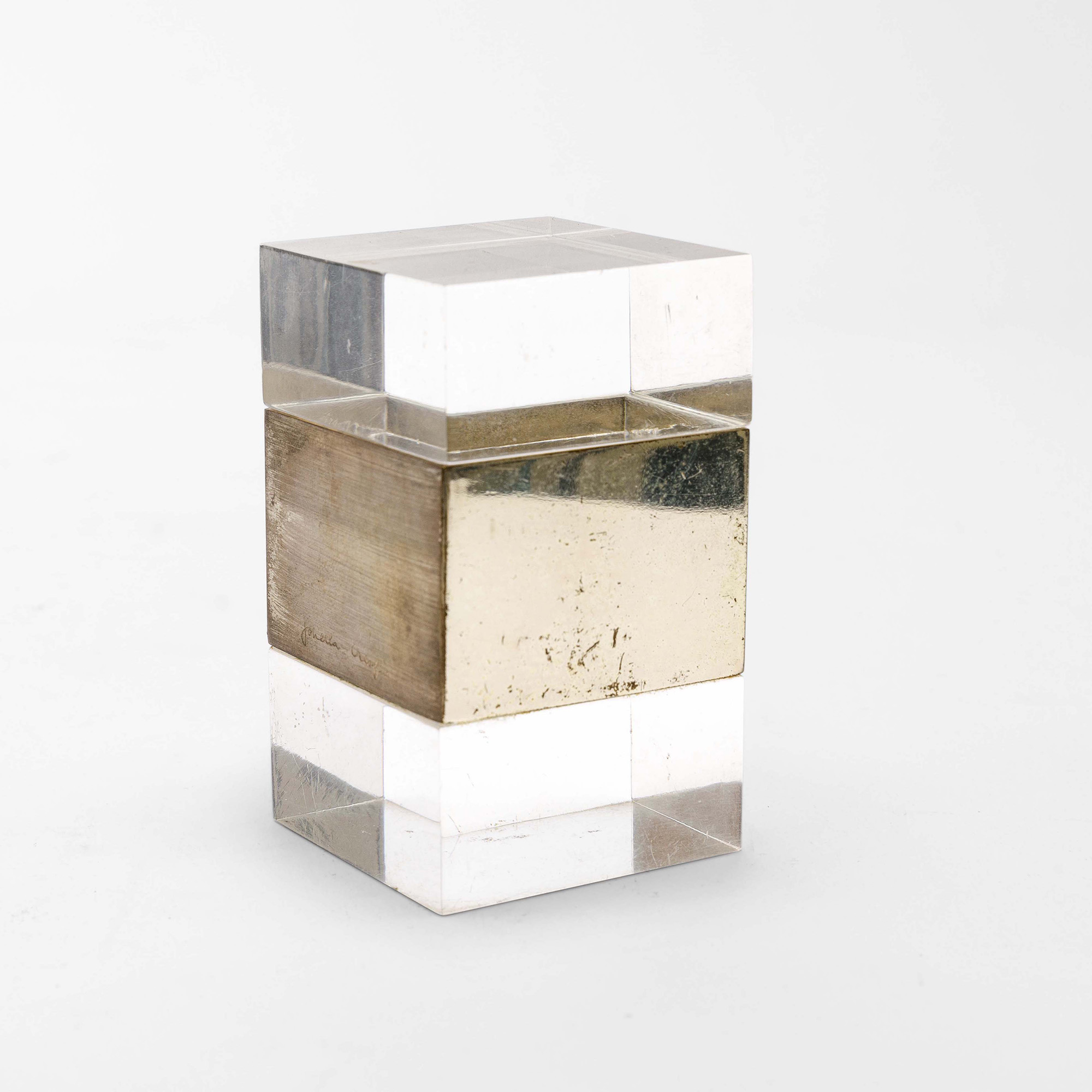 Gabriella Crespi, Scatola in plexiglass con elementi in acciaio. Firma incussa. Prod. Italia, 1970 ca. cm 5x5x9,5