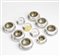 Gabriella Crespi, Set di quattro portacandele piccoli e sei grandi con struttura in vetro. Vaschette interne in metallo. Etichette metalliche con firma. Prod. Italia, 1970 ca. Portacandele grandi cm 6,5x2,5; portacandele piccoli cm 4,5x2