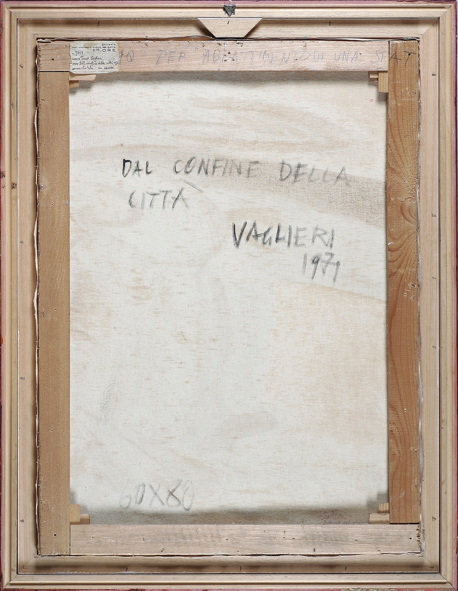 VAGLIERI TINO (1929 - 2000) Dal confine della città. 1971. Olio su tela. Cm 60,00 x 80,00. Firma e anno in basso a sinistra. Al retro cartiglio della galleria Delle Ore, Milano, titolo, firma e anno. Autentica dell'artista su fotografia. Cornice presente
