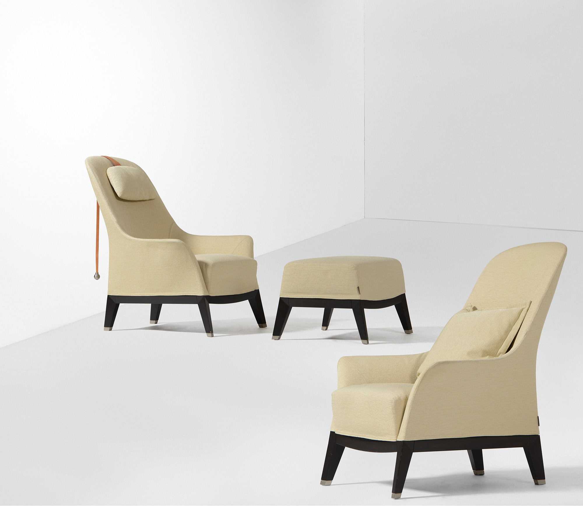 Set di due poltrone con un pouff. Struttura in legno e rivestimenti in tessuto.,