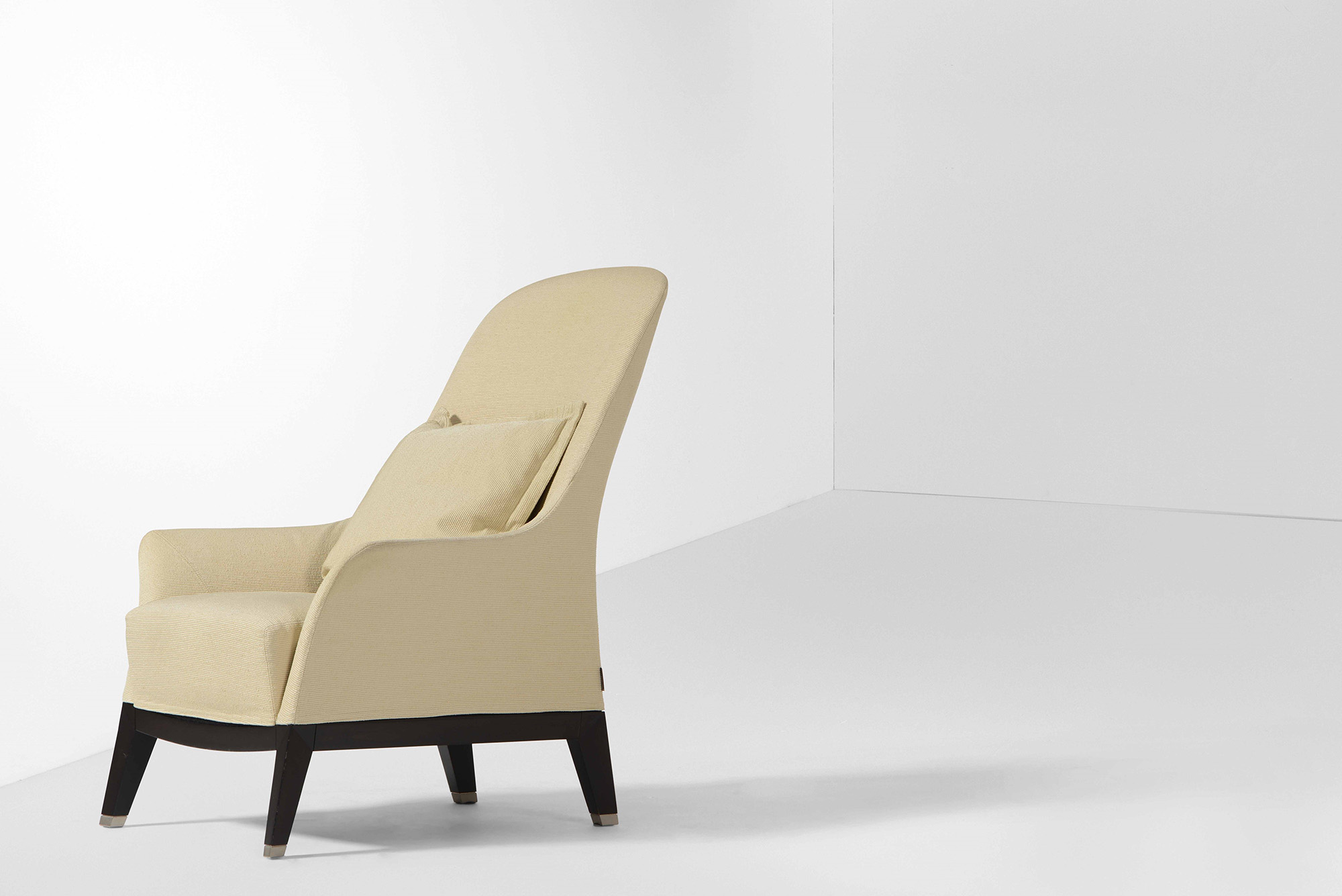 Set di due poltrone con un pouff. Struttura in legno e rivestimenti in tessuto., Prod. Italia, 2000 ca. poltrone cm 78x90x100; pouff cm 53x62x40