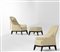 Set di due poltrone con un pouff. Struttura in legno e rivestimenti in tessuto.,