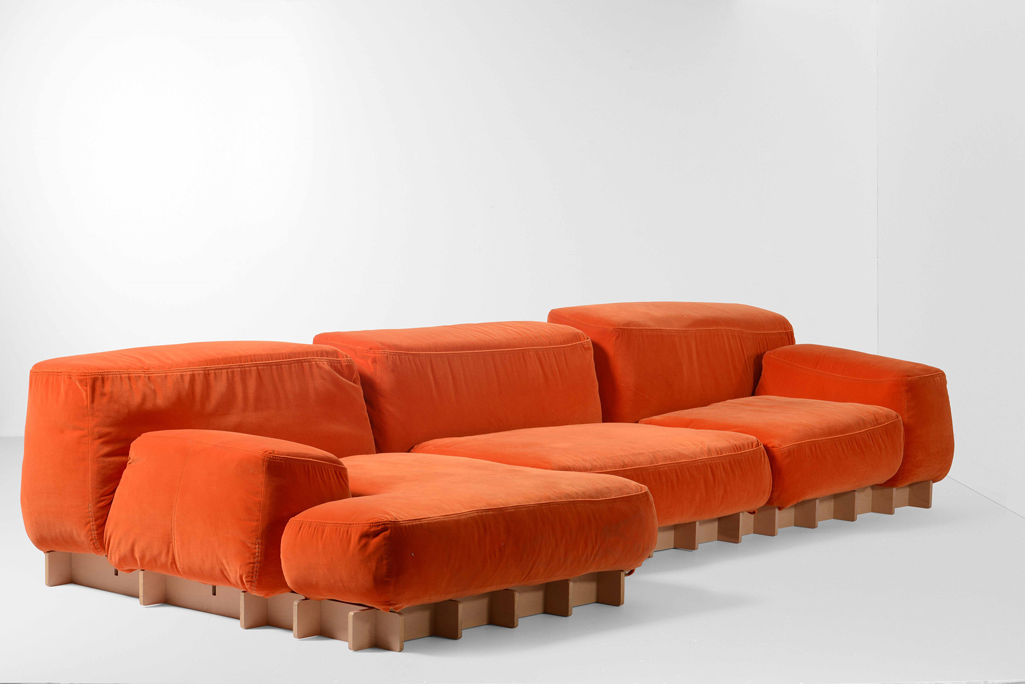 Grande divano modulare con struttura in legno e rivestimenti in tessuto.,