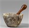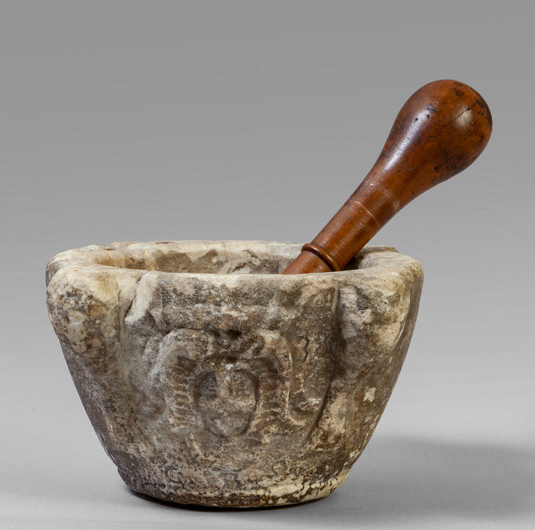 Grande mortaio in marmo con stemma della città di Genova d.to e s.to G.B.S. sec.XVI (cm.32x17) con pestello in bosso (h.cm.36)
