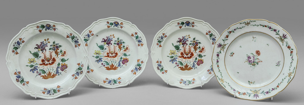Tre piatti in porcellana Ginori decorati con il garofano in policromia su fondo bianco sec.XVIII (diam.cm.23) ed un piatto in porcellana di Venezia marca 'Ancora d'oro' Cozzi