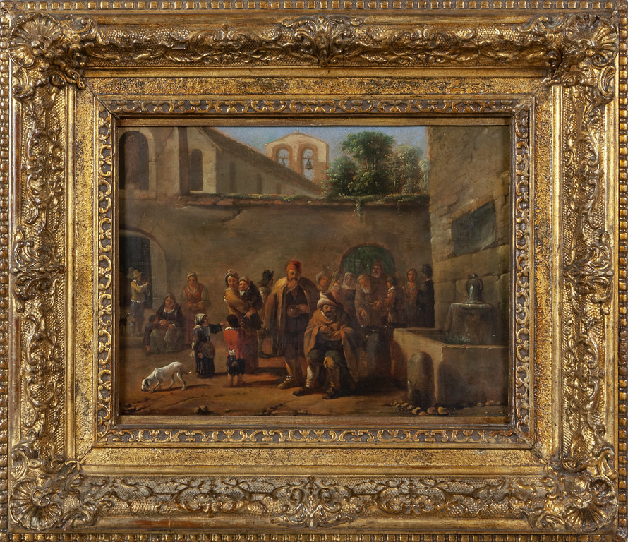 Scuola fiamminga-romana sec.XVII 'Mendicanti presso una fontana' olio su tavola