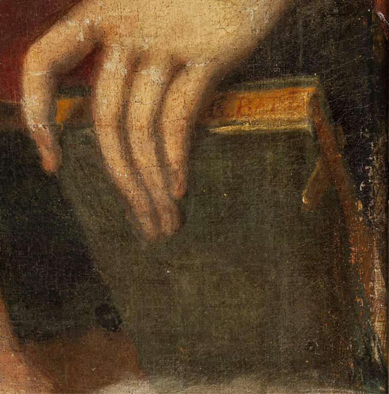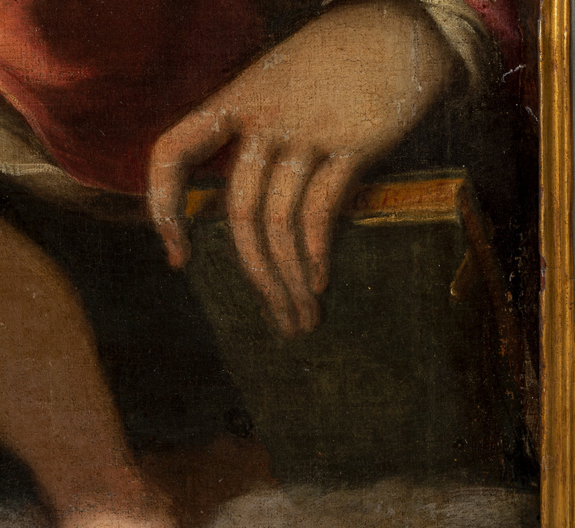La firma che si scorge sulle pagine del libro retto dalla Vergine conferma l'attribuzione di questo dipinto inedito al pittore genovese Giovanni Battista Paggi che i caratteri stilistici di per sé rendono evidente. È possibile leggere la scritta nei tipici caratteri dell'elegante capitale quadrata romana utilizzata sempre dal colto pittore aristocratico 'GIO. BATTA/'' seguita sulla costa verticale del libro dal cognome PAGGI poco leggibile perché abraso.