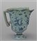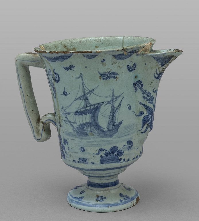Versatoio in ceramica di Savona decorazione in blu con navigli su fondo berrettino marca Stemma sec.XVIII (difetti e rotture)