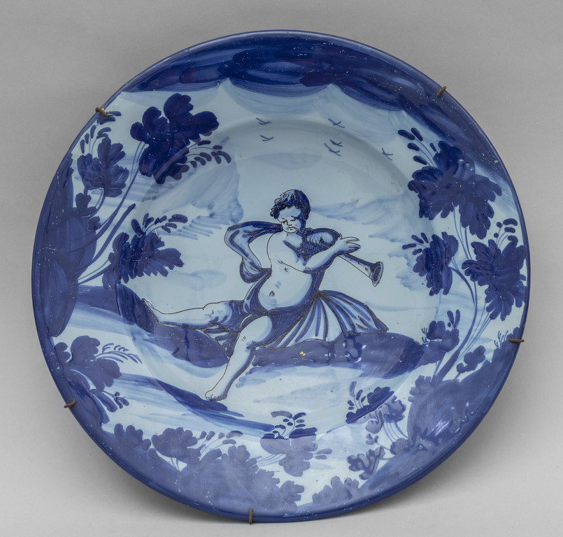 Piatto in ceramica decorato in blu su fondo berrettino con putto musicante al centro Angarano sec.XVIII