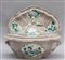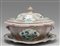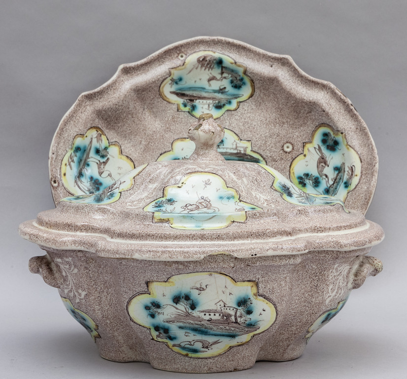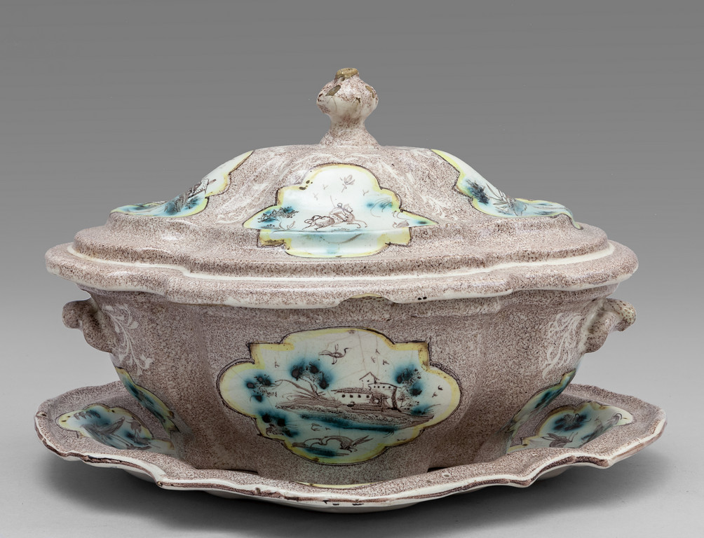 Zuppiera con sottopiatto in ceramica decorazione a riserve policroma su fondo manganese marca AL Savona sec.XVIII