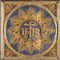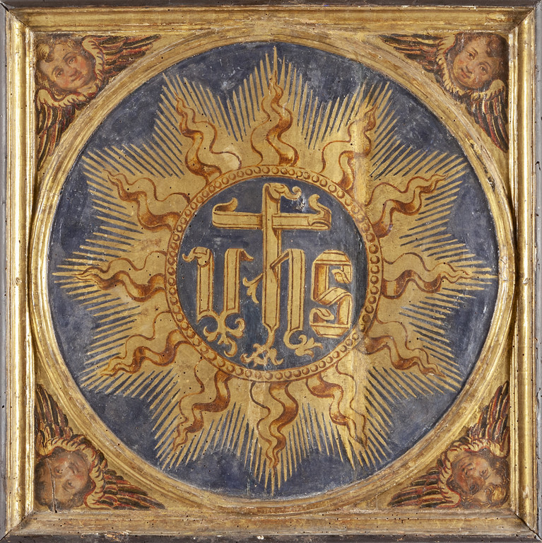 Pannello in legno dipinto a fondo oro con stemma di San Bernardino e quattro angioletti ai lati sec.XVII