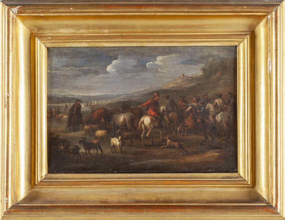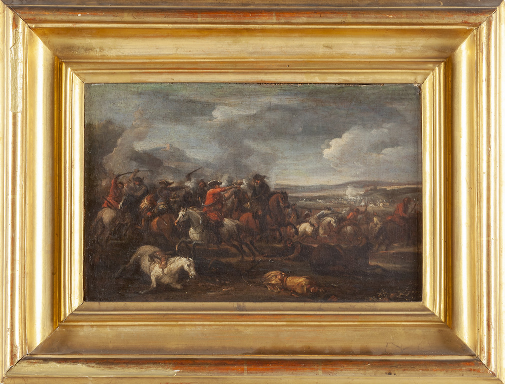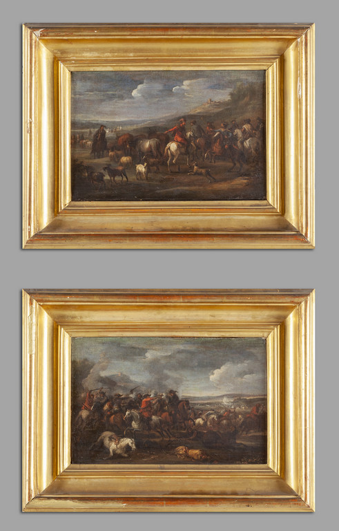 Scuola emiliana sec.XVII 'Battaglie' coppia di olii
