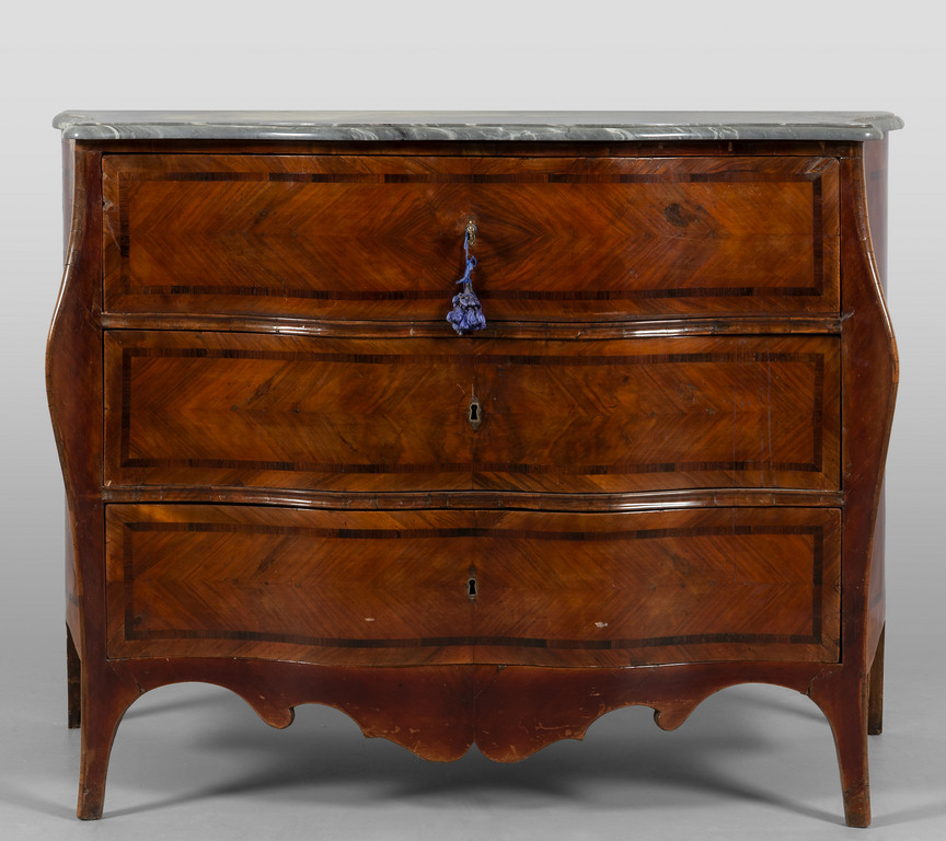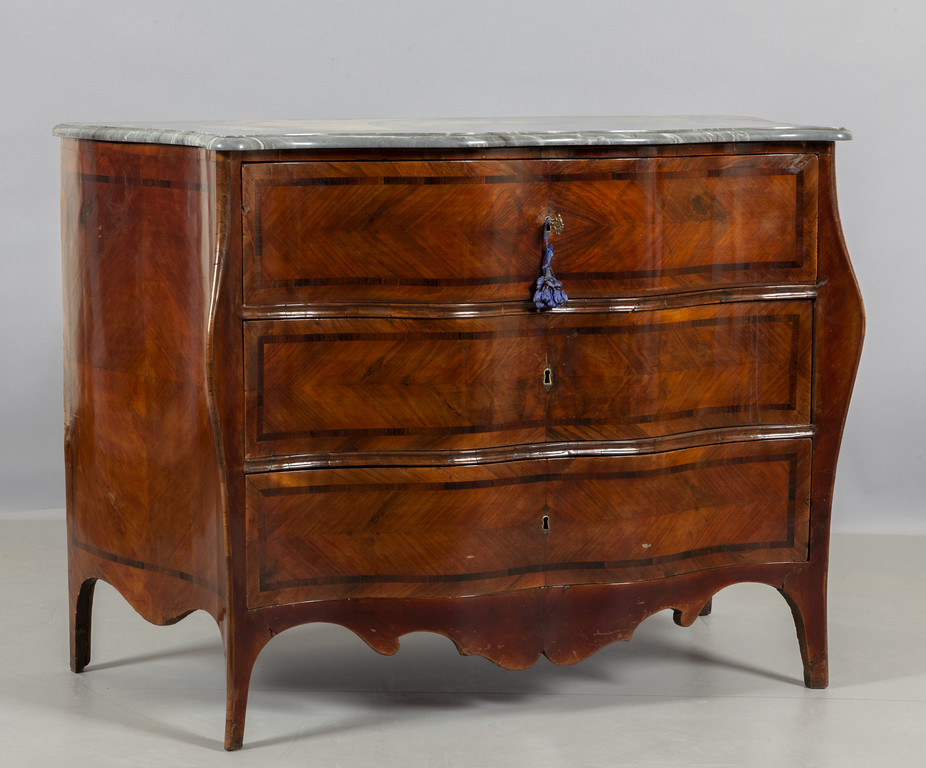 Comò Luigi XIV a doppia mossa sul fronte con alette e fianchi mossi lastronato in palissandro piano in marmo coevo Genova I metà sec.XVIII