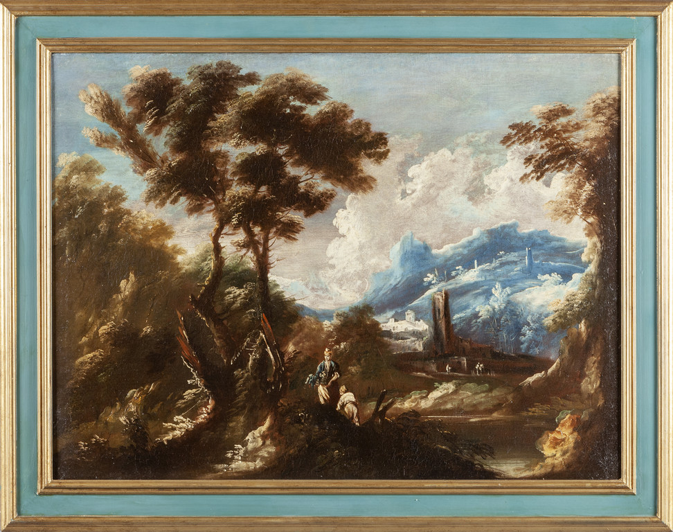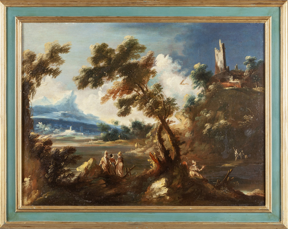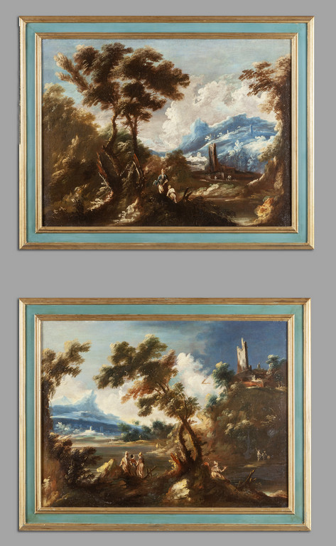 Scuola genovese sec.XVII 'Paesaggi con personaggi' coppia di olii