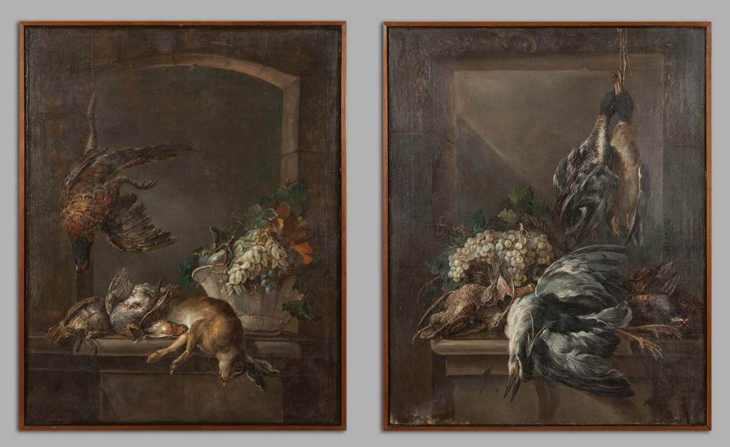 Scuola francese sec.XVIII 'Nature morte con cacciagione' due olii