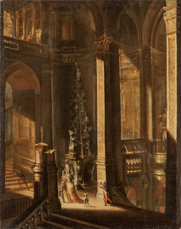Scuola emiliana sec.XVII 'Architetture con figure' olio