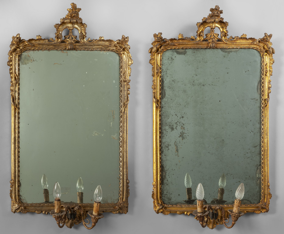 Coppia di grandi apliques con specchio in legno finemente intagliato e dorato alla base due braccetti portaluce Napoli I metà sec.XVIII