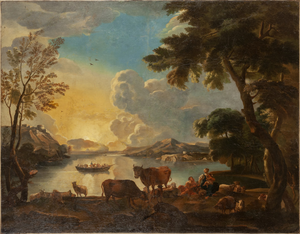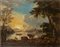 Scuola genovese inizi sec.XVIII 'Paesaggio animato con veduta di lago' olio
