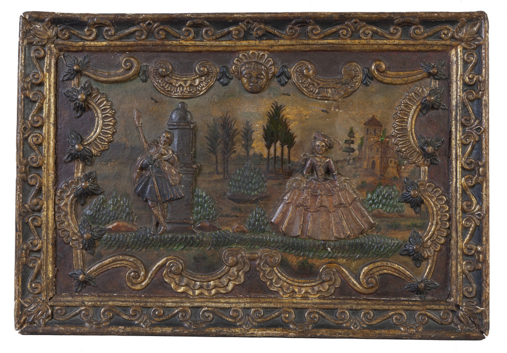 Pannello in legno finemente intagliato dorato e laccato con figure in pastiglia policroma applicazioni di stampe colorate Venezia metà sec.XVIII
