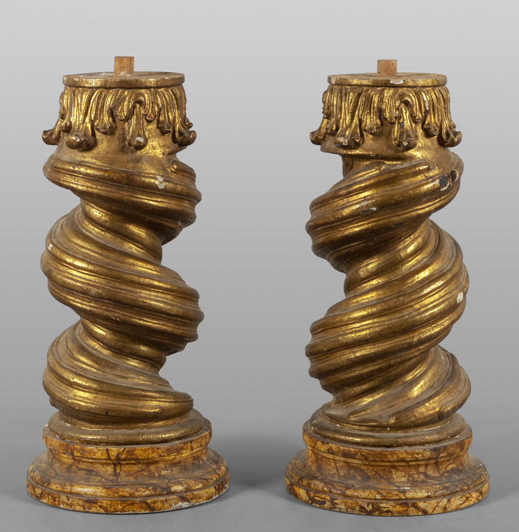 Coppia di colonne a tortiglione in legno intagliato e dorato sec.XVIII