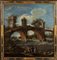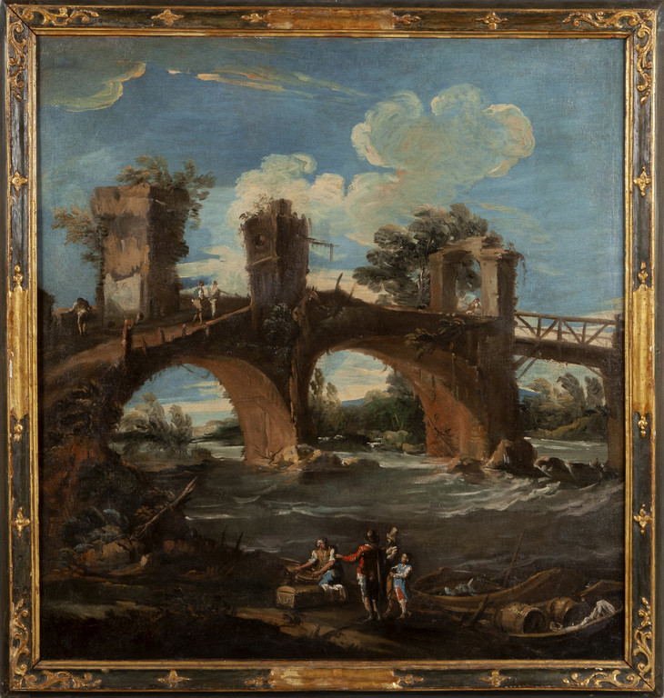 Scuola veneta sec.XVIII 'Paesaggio con ponte e figure' olio cornice in legno laccato e dorato