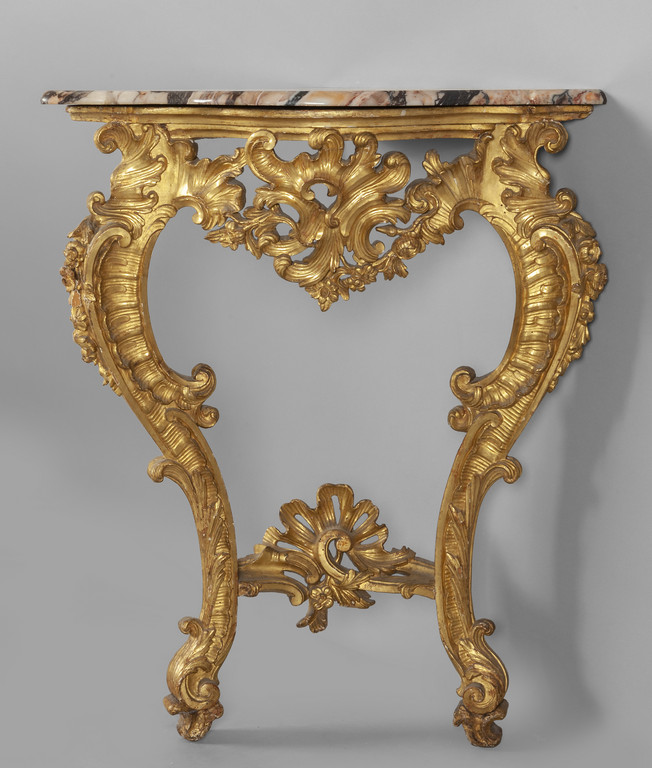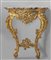Console Luigi XV ad angolo in legno intagliato e dorato due gambe raccordate da traversa piano in marmo Roma sec.XVIII