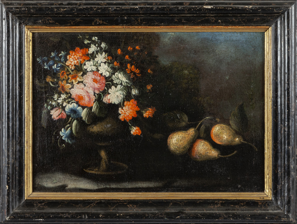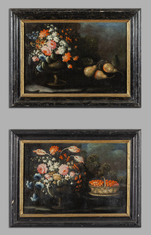 Scuola piemontese sec.XVII 'Nature morte con fiori e frutta' coppia di olii