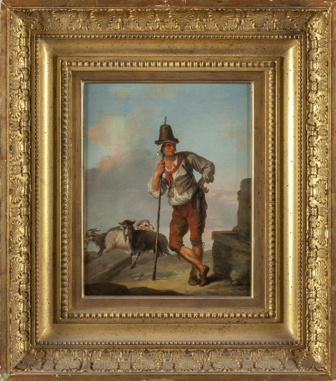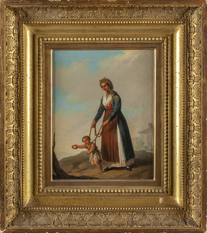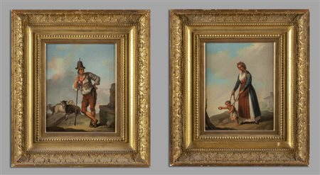 Scuola romana sec.XIX 'Al pascolo' e 'I primi passi' coppia di olii cornici in legno finemente intagliato e dorato