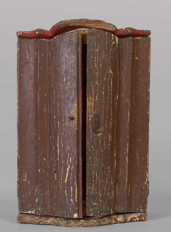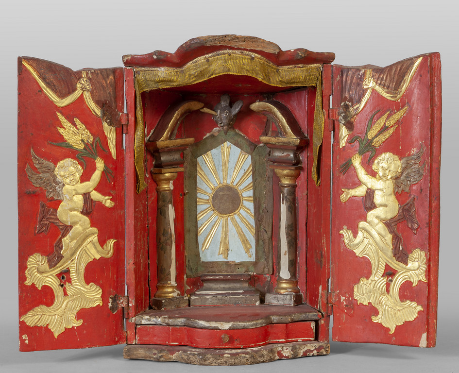 Altarolo portatile in legno laccato in policromia con figure di angeli dorati su fondo rosso cassettino sottostante nella parte centrale due colonne marmorizzate sormontate dallo Spirito Santo Italia Centrale I metà sec.XVIII