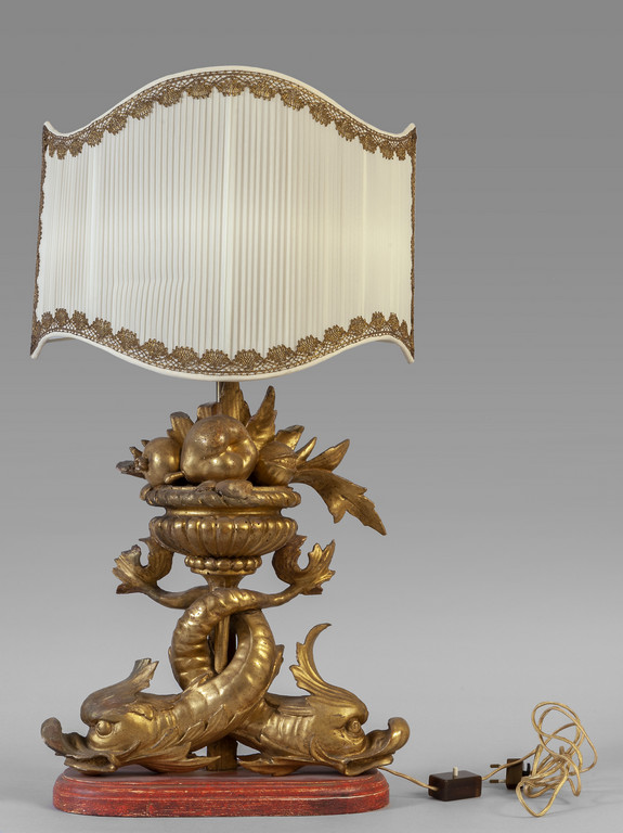 Lampada in legno dorato alla base due delfini intrecciati che sorreggono un cesto di frutta sec.XVIII/XIX