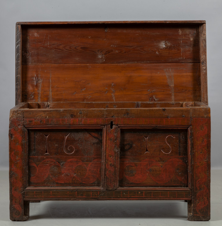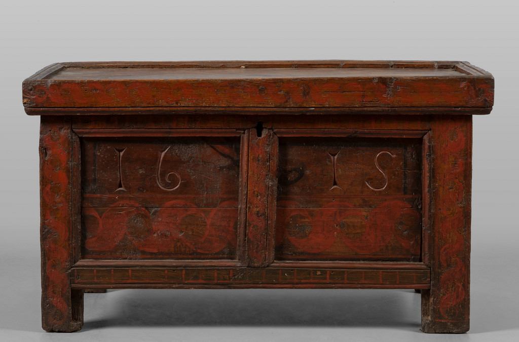 Cassapanca altoatesina in legno laccata sul fronte e datata 1615